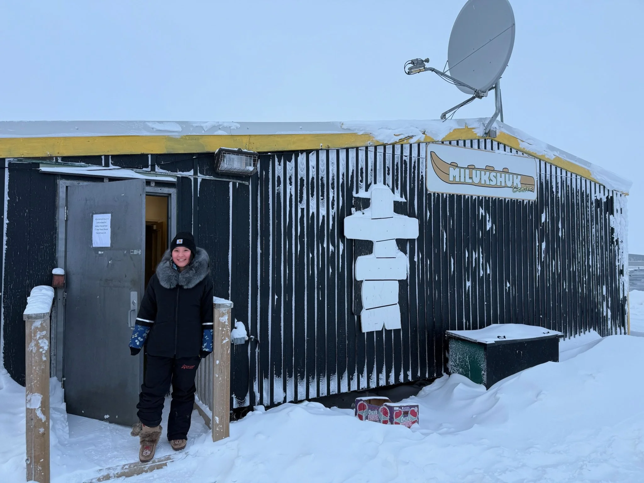 Our three-day workshop began on Tuesday morning in the Milukshuk Centre, the same lovely space that was provided two years ago by the Hamlet (That one of our workshop stars, Lalita Atatahak standing at the door).
