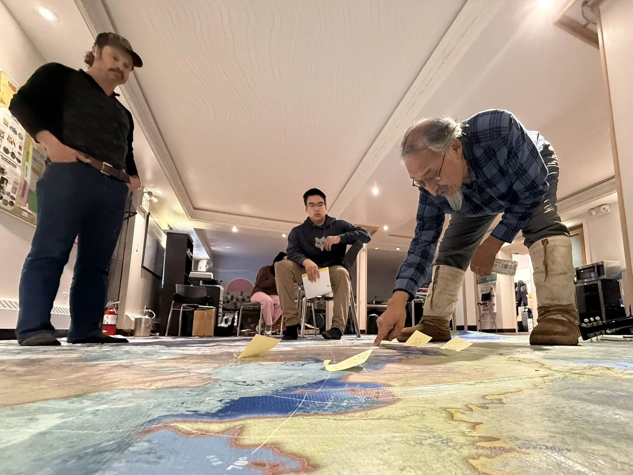 Wednesday, Lynn and Joe co-hosted a song-building session based on a classroom-sized floor map of the Arctic. This seemed to keep everyone's attention and was a one-off kind of cross-cultural instructional duo that was totally engaging. Here's Joe pointing out a place on the map and telling yet another story that one day might make it into song.